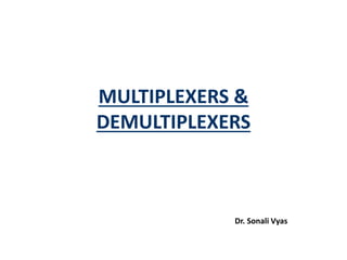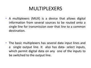 A multiplexer is a device that selects one of several analog or digital input signals and forwards the selected input into a single line. It has multiple data inputs, a single output, and select lines that determine which input is directed to the output. A demultiplexer performs the opposite function, taking a single input and distributing it to one of multiple outputs based on the select lines. Multiplexers and demultiplexers come in various configurations depending on the number of inputs and outputs, such as 2:1, 4:1, 16:1 or 32:1. They are basic building blocks used in digital systems and communication networks to efficiently route signals.