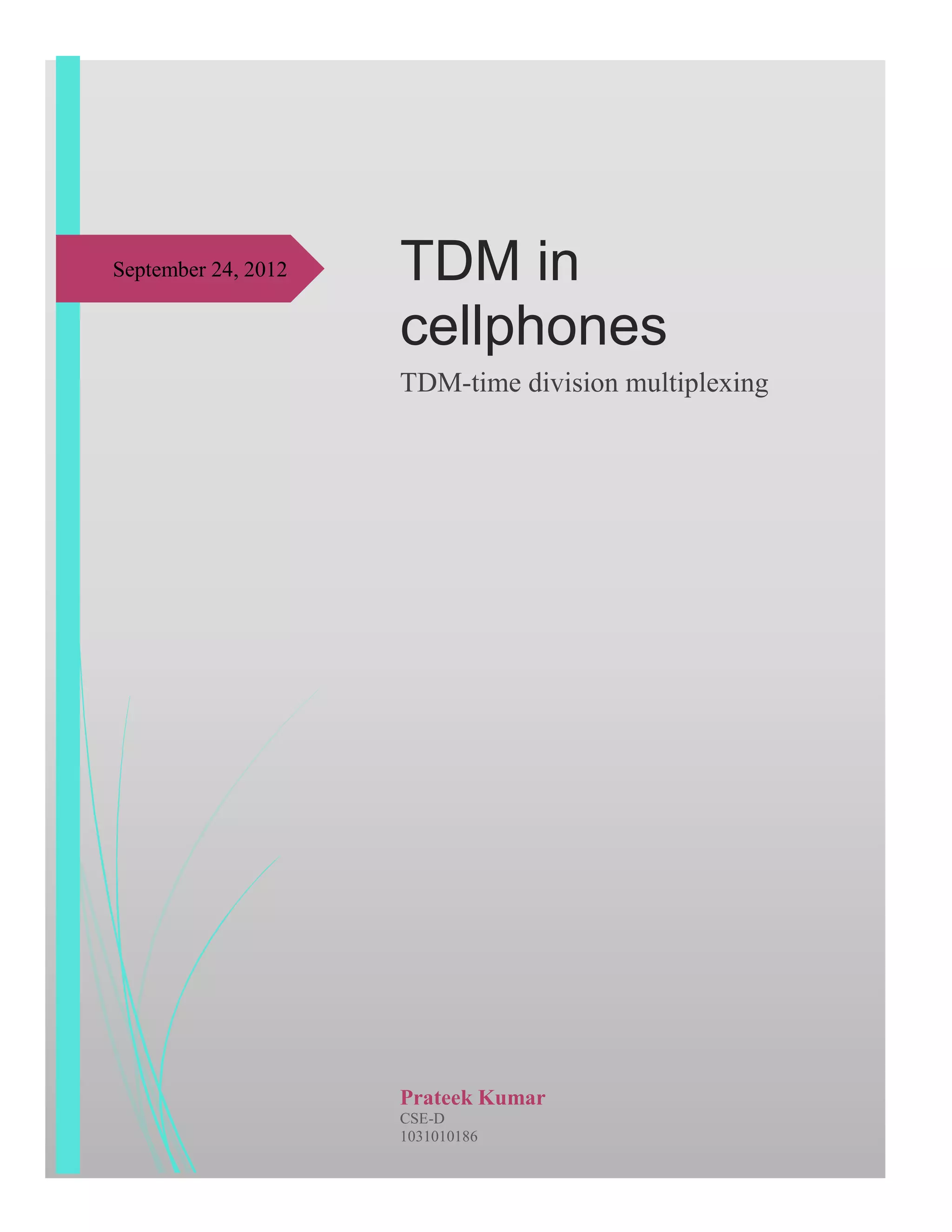 Time division multiplexing (TDM) is a technique used in telecommunications to transmit multiple signals over a shared medium. It involves dividing a signal into multiple time slots and assigning each slot to a different signal. TDM was initially developed for telegraphy in 1870 and is now widely used. It is used in digital networks like TDM telephone networks and synchronous digital hierarchy (SDH) networks to efficiently allocate bandwidth to multiple signals or data streams. Common examples of TDM include digitally transmitting multiple telephone calls over the same cable or interleaving left and right stereo signals in an audio file.