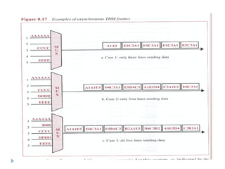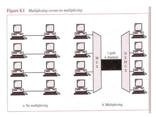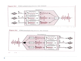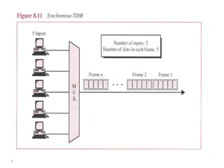 Multiplexing allows the simultaneous transmission of multiple signals across a single data link using techniques like frequency division multiplexing (FDM), wavelength division multiplexing (WDM), and time division multiplexing (TDM). FDM combines signals by allocating each a different frequency band. WDM is similar but uses light signals transmitted through fiber optic channels. TDM is a digital process that combines data by allocating time slots, with synchronous TDM assigning fixed slots and asynchronous TDM allowing flexible slot allocation.