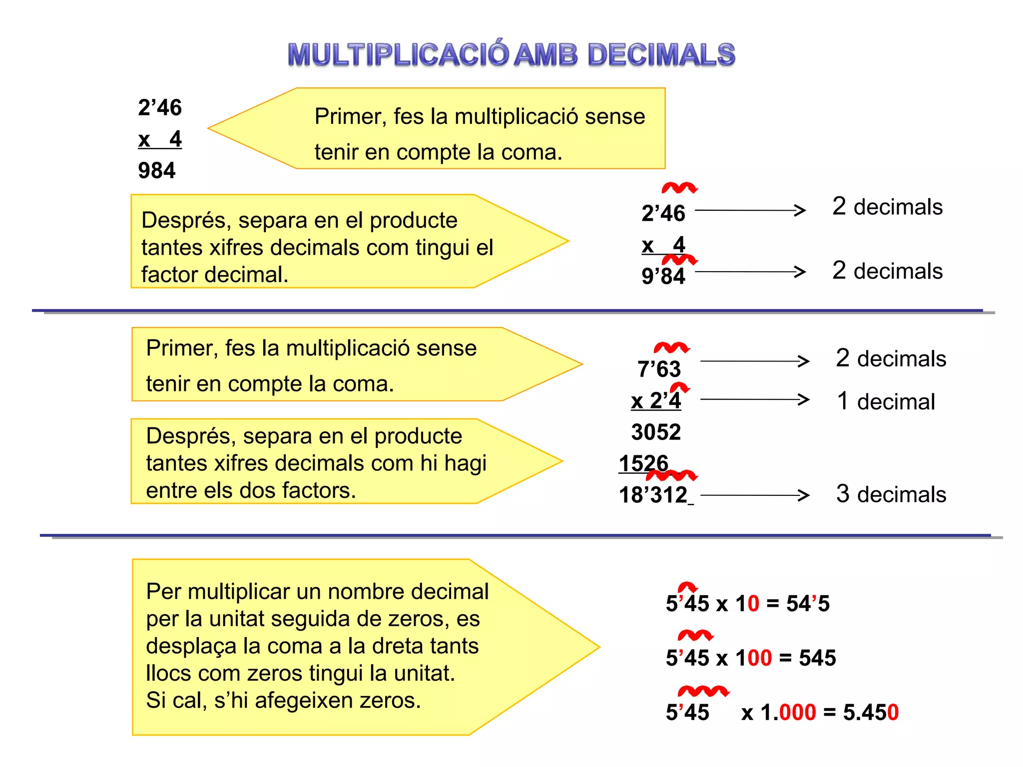 2’46 x 4 984 Primer, fes la multiplicació sense tenir en compte la coma. Després, separa en el producte tantes xifres decimals com tingui el factor decimal. 2’46 x 4 9’84 2 decimals 2 decimals Primer, fes la multiplicació sense tenir en compte la coma. Després, separa en el producte tantes xifres decimals com hi hagi entre els dos factors. 2 decimals 3 decimals 7’63 x 2’4 3052 1526_ 18’312 1 decimal Per multiplicar un nombre decimal per la unitat seguida de zeros, es desplaça la coma a la dreta tants llocs com zeros tingui la unitat. Si cal, s’hi afegeixen zeros. 5 ’ 45 x 1 0 = 54 ’ 5 5 ’ 45 x 1 00 = 545 5 ’ 45 x 1. 000 = 5.45 0