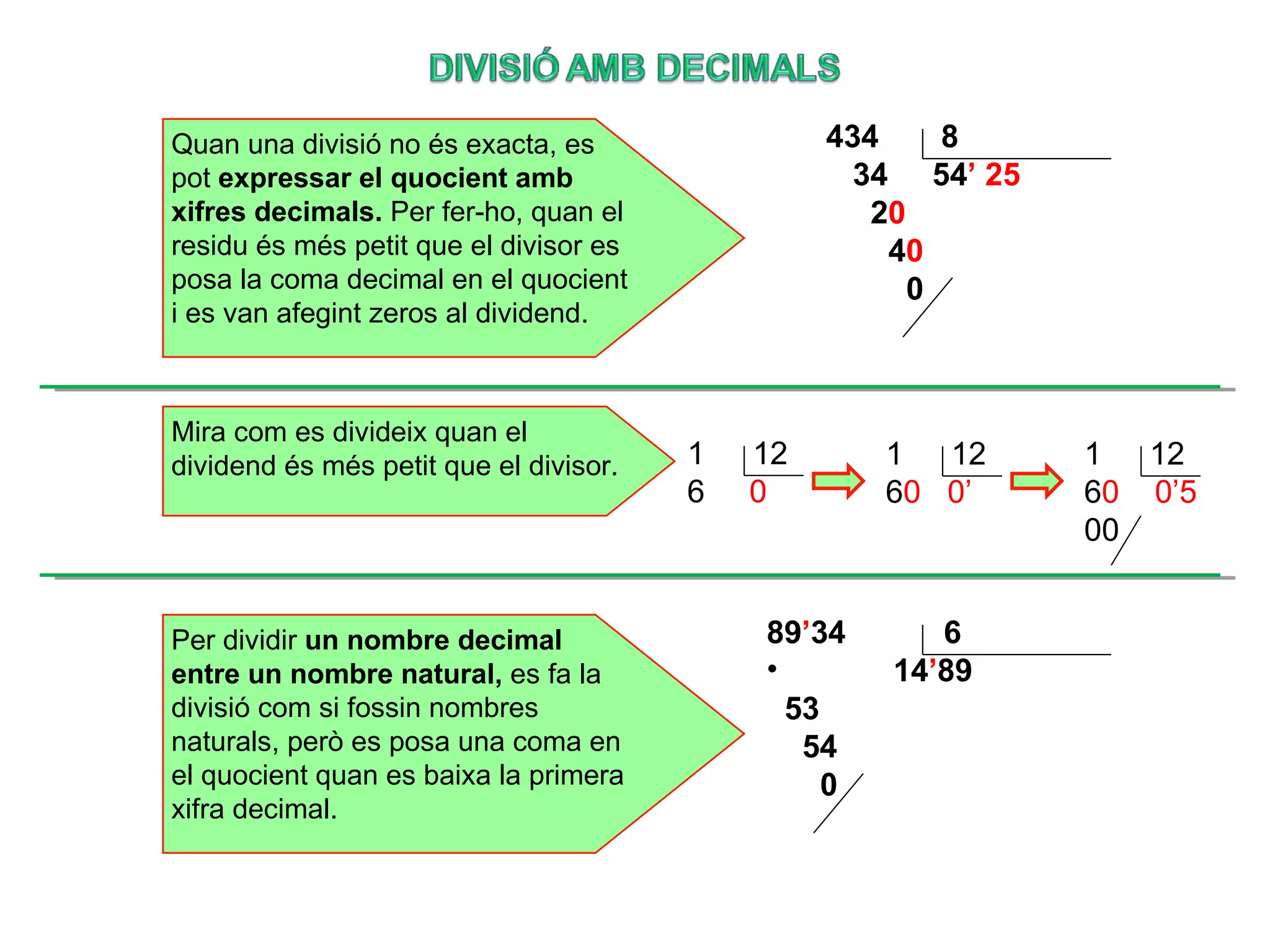 43’5 : 0’75Per dividir un nombre natural entre un nombre decimal, se suprimeix la coma del divisor i s’afegeixen al dividend tants zeros com xifres decimals tingui el divisor. 147000 125 0220 1176 0950 0750 000 1.470 : 1’25 Per dividir dos nombres decimals, se suprimeix la coma del divisor i es desplaça la coma del dividend tants llocs a la dreta com xifres decimals tingui el divisor. Si cal, s’afegeixen zeros al dividend. 4350 75 600 58 00