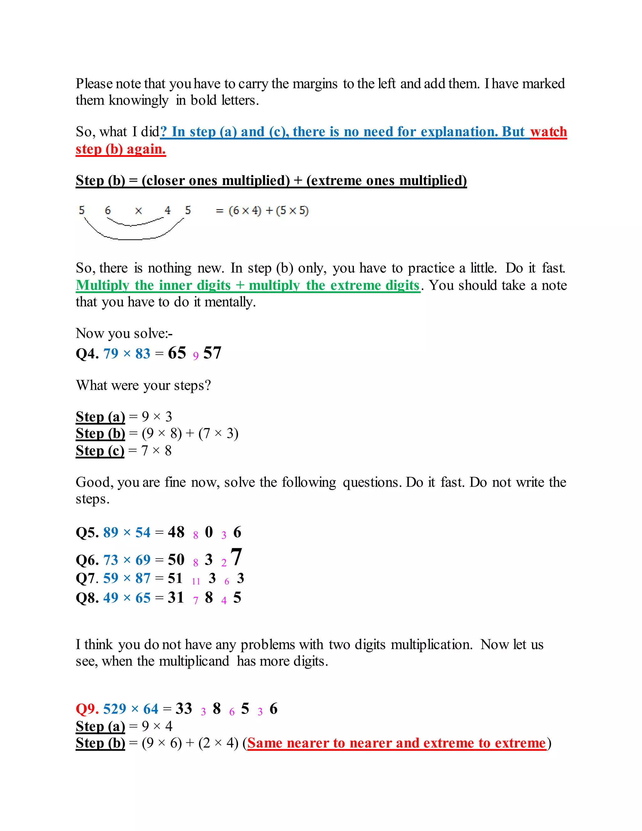 1) The document teaches a method for multiplying multi-digit numbers mentally in a step-by-step fashion by breaking the problem down into multiplying individual digits.