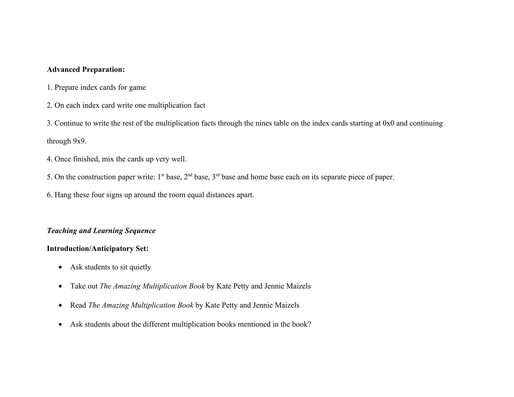 The document provides a lesson plan for a 45-minute lesson to review multiplication facts through the nines table. The lesson involves playing a game of multiplication baseball where students take turns answering multiplication fact questions and advance around bases depending on whether their answer is correct. The plan details how to set up and play the game, as well as assessments to evaluate students' understanding of their multiplication fact strengths and weaknesses.