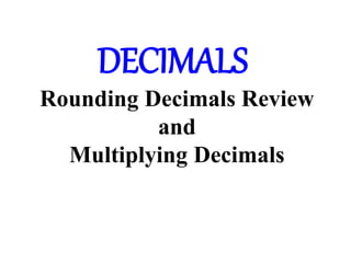 The document discusses multiplying decimals. It provides steps for multiplying decimals which include writing the problem vertically, ignoring the decimal points and multiplying, then determining where to place the decimal point in the product based on how many places the decimal point moved. Several examples are shown of multiplying decimals with explanations of applying the steps. The document also discusses determining the number of decimal places in a product of decimals.
