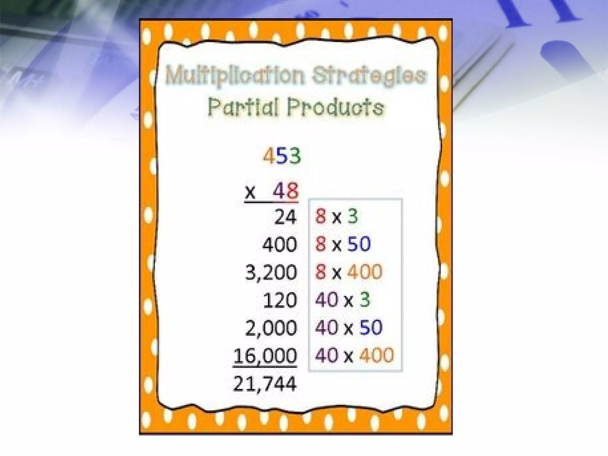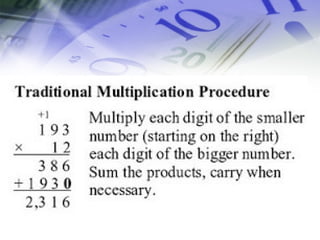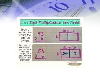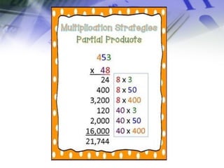 This document provides an overview of multiplication fluency strategies including the partial products method, lattice method, and place value method. It also lists citations for additional resources on multiplication strategies, memorizing multiplication facts, algorithms and analysis, and multiplying multi-digit numbers.