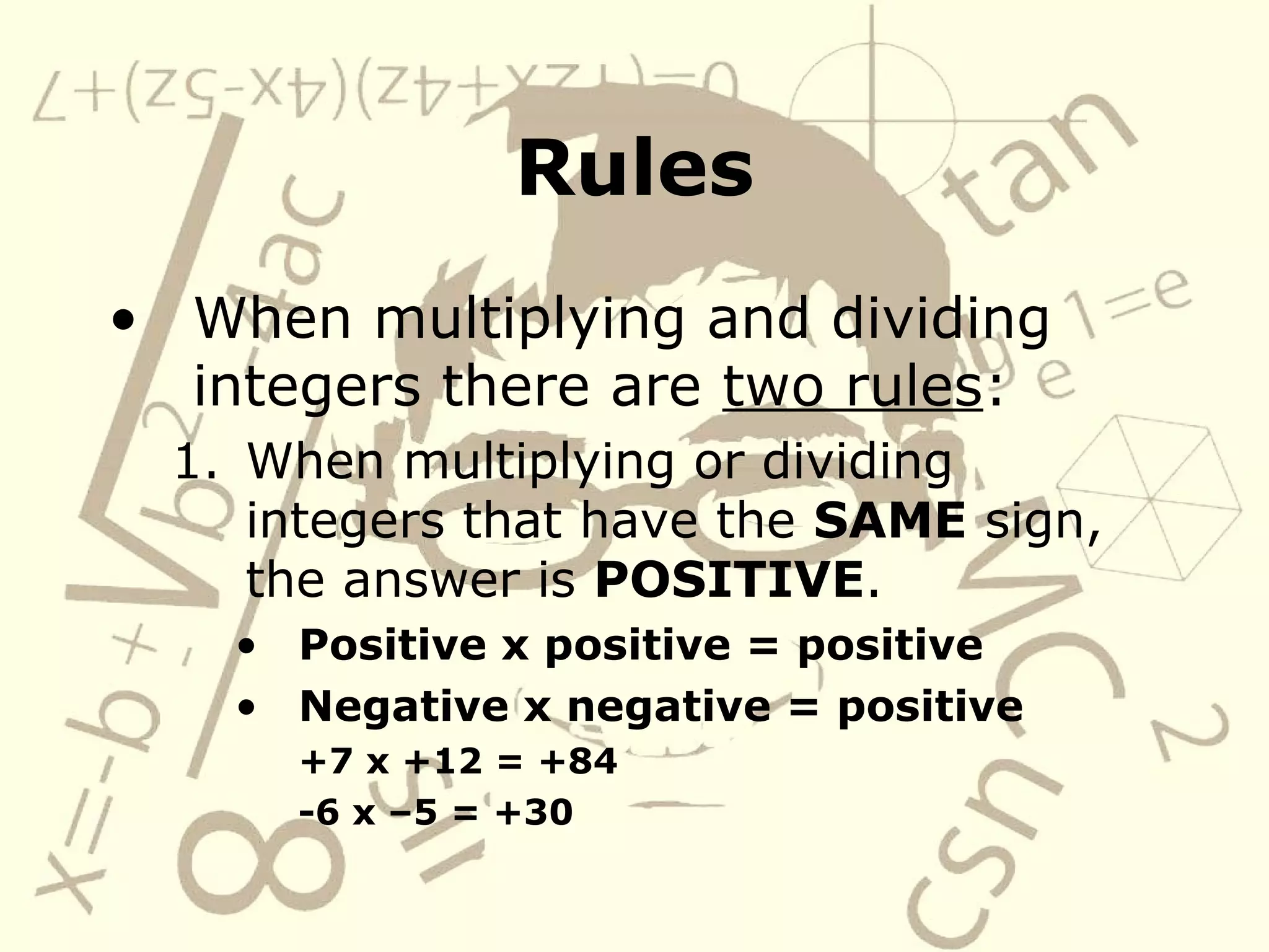This document discusses the rules for multiplying and dividing integers. It states that when multiplying or dividing integers with the same sign, the answer is positive, but when the signs are different, the answer is negative. It provides examples of multiplying and dividing positive and negative integers. It then has practice problems for the reader to solve with the guidance to determine if the answer should be positive or negative based on the signs of the integers.