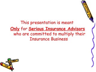 This presentation targets serious insurance advisors looking to grow their business by acquiring new customers and earning more within the next year. It addresses the challenges of gaining trust and standing out in a competitive market, emphasizing the need to differentiate oneself from other advisors. Advisors are invited to learn how to build trust and get opportunities to serve prospects by contacting the presenter directly.
