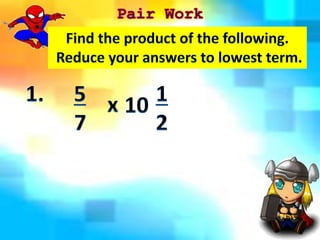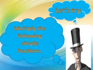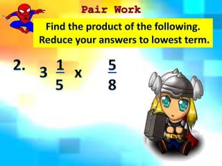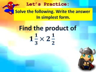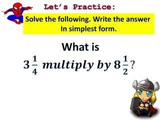 The document discusses multiplying mixed fractions and improper fractions. It provides examples of changing mixed numbers to improper fractions and multiplying fractions. It also asks the reader to solve several fraction multiplication problems by changing any mixed numbers to improper fractions first before multiplying.