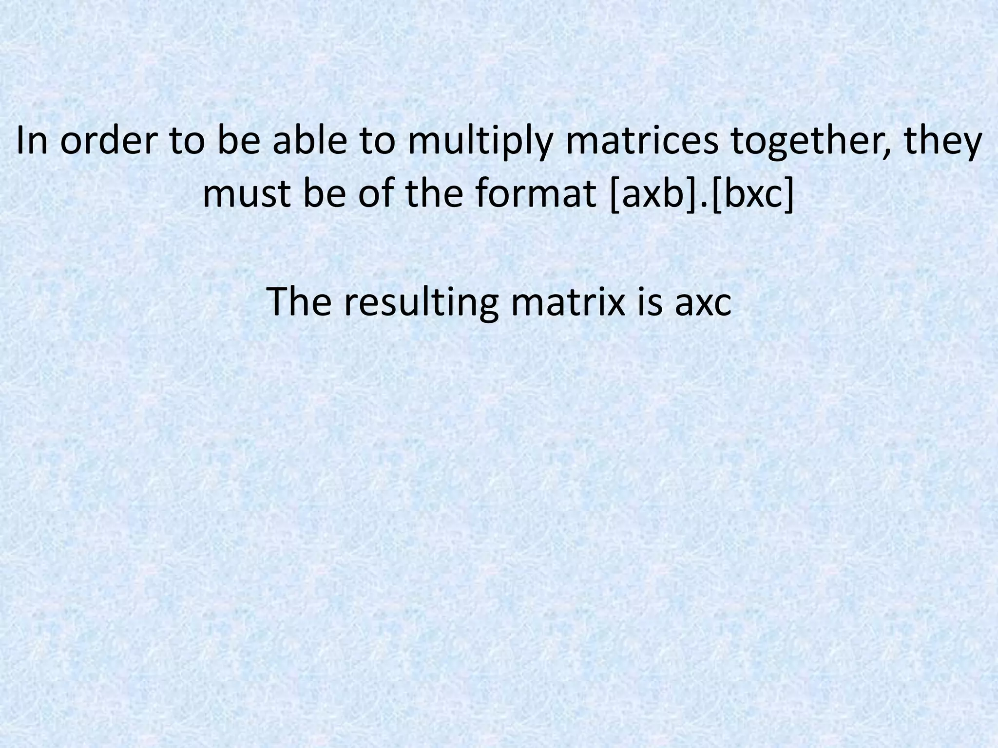 ![In order to be able to multiply matrices together, they must be of the format [axb].[bxc]](https://image.slidesharecdn.com/multiplyingmatrices-110726010749-phpapp02/75/Multiplying-Matrices-1-2048.jpg)