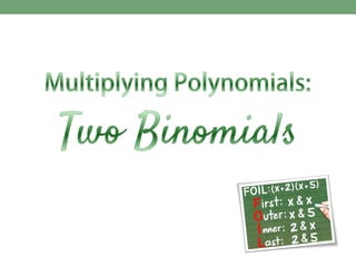 2. Examples are provided of multiplying polynomials using algebra tiles, the distributive property, the box method, and FOIL (First, Outer, Inner, Last).
