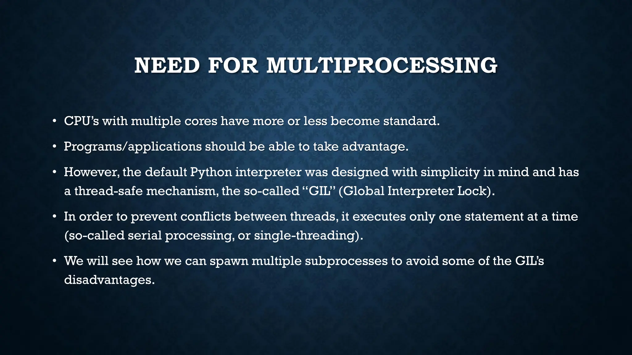 • We will see how we can spawn multiple subprocesses to avoid some of the GIL’s