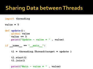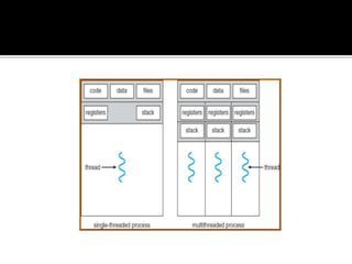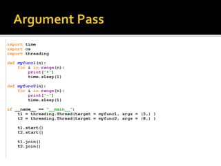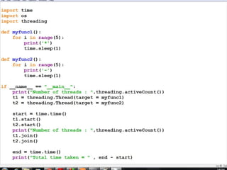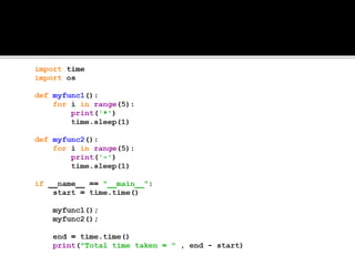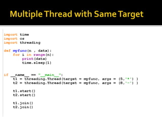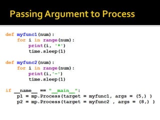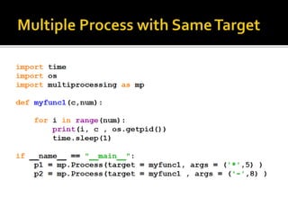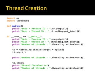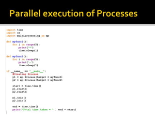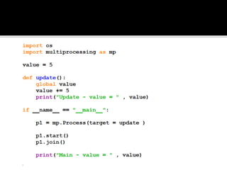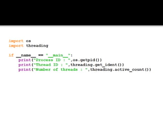 A process is a running program with a unique ID that can be retrieved using os.getpid(). Processes can have child processes with IDs retrieved by os.getppid(). Multiprocessing allows a system to run multiple processes simultaneously. The Process class is used to create processes that execute target functions. Process synchronization prevents race conditions when accessing shared resources through critical sections. The Lock class manages access to shared resources across processes. Threads are sequences of execution within a process that can improve program throughput.