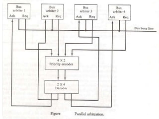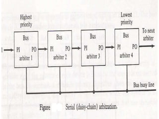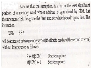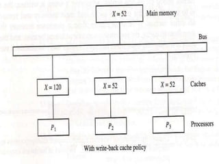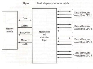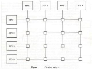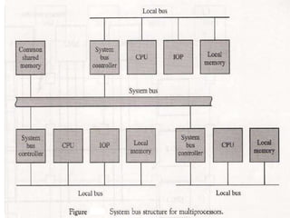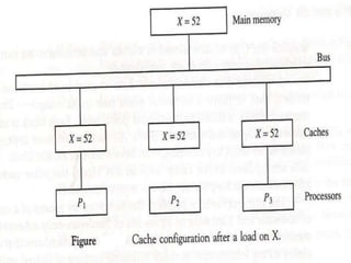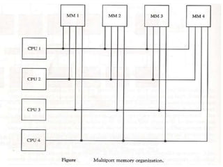 This document discusses multiprocessor systems, including their interconnection structures, interprocessor arbitration, communication and synchronization, and cache coherence. Multiprocessor systems connect two or more CPUs with shared memory and I/O to improve reliability and enable parallel processing. They use various interconnection structures like buses, switches, and hypercubes. Arbitration logic manages shared resources and bus access. Synchronization ensures orderly access to shared data through techniques like semaphores. Cache coherence protocols ensure data consistency across processor caches and main memory.