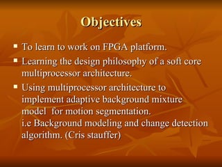 The document discusses the design of a soft core multiprocessor architecture on an FPGA to implement an adaptive background mixture model algorithm for motion segmentation in images. The goals are to learn FPGA design, leverage parallelism for real-time processing, and use a multiprocessor approach to process different image regions simultaneously. Each processor will perform the algorithm on a sub-region of the image in parallel. They will communicate via shared external memory and FIFO-based links. The proposed architecture includes multiple MicroBlaze processors connected in an array topology to process images from a video camera in real-time.