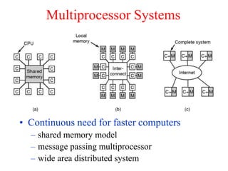 The document discusses multiple processor systems including multiprocessors, multicomputers, and distributed systems. It covers topics such as multiprocessor hardware architectures, operating systems, scheduling, synchronization, communication in multicomputers, and different types of middleware for distributed systems including document-based, file system-based, shared object-based, and coordination-based middleware.