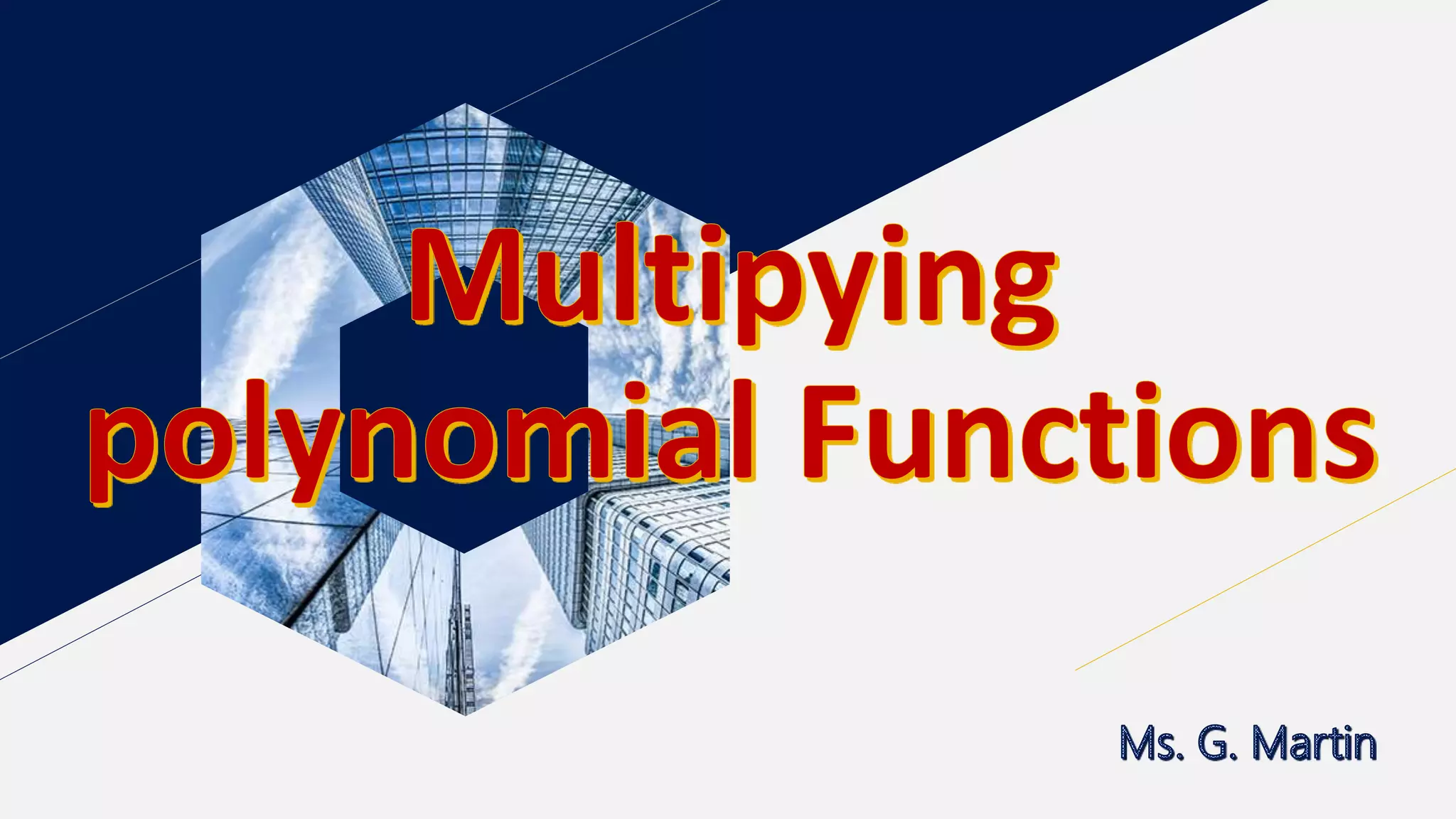 To multiply polynomial functions f and g: 1. Multiply the first term of f with each term of g to get partial products 2. Add the partial products For the given polynomials f(x) = 7x + 1, g(x) = 4x - 7, h(x) = 2x^2 - 3x + 5: (f·g)(x) = 28x^2 - 45x - 7 (h·g)(x) = 8x^3 - 26x^2 + 41x - 35 (f·h)(x) = 14x^3 - 19x^2 + 32x + 5
