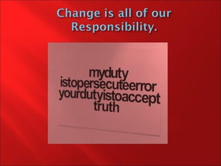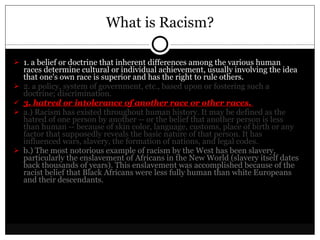 This document discusses the changing racial demographics in America and issues of racism and tolerance. It notes that as the US becomes more multiracial, there is hope that society will become more accepting of people from all backgrounds. However, racism still exists and many challenges remain, such as confronting stereotypes, having open discussions about race, and moving beyond just tolerance to acceptance of all people regardless of their race or ethnicity. The document advocates for equality and argues that as diversity increases, the importance of racial categories may diminish over time.