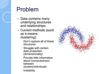 The document discusses multiscale mapper networks as a solution to limitations of current clustering methods, emphasizing the need to capture underlying structures and relationships in high-dimensional data. It introduces key concepts like topological clustering, the mapper algorithm, and network analytics for assessing cluster relationships. The proposed method aims to improve robustness, stability, and hierarchical representations of data while effectively handling complex structures.