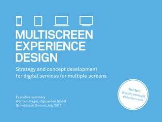 The document outlines a multiscreen experience design strategy developed by Digiparden GmbH, focusing on digital services across various screens. It highlights user behaviors and contexts of use for smartphones, tablets, desktops, and smart TVs, emphasizing the integration and complementary use of devices. The publication includes user prototypes and explores advanced themes like gamification and emotional engagement in media consumption.