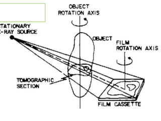 2) Transaxial tomography images sections of the body transversely using a rotating chair and stationary x-ray tube, allowing for coronal and sagittal plane images.