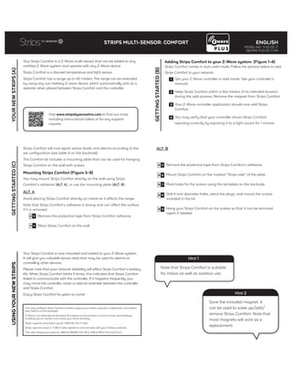 This document provides instructions for setting up and using the Strips Comfort multi-sensor device with a Z-Wave home automation system. It can measure temperature, light, and detect moisture. The sensor has a 40m range and comes with a mounting plate to attach it to walls or surfaces. To add it to a Z-Wave network, put the controller in add mode, wake up the sensor by removing its magnet, and verify it is reporting data correctly. The sensor's configuration and operation can be customized using its parameters in the Z-Wave controller.