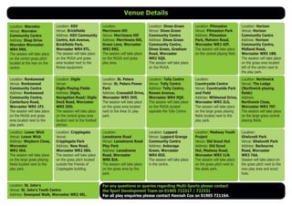 This document provides details of venues and times for a multi-sports program taking place the week of July 23rd-27th 2012. It lists 16 different venue locations across Worcester and the activities/times scheduled at each one throughout the week. Sessions are offered mornings from 10am-11:45am and afternoons from 1pm-2:30pm or 1pm-2:45pm depending on the day. Contact information is provided for any questions about the multi-sports program or play activities.