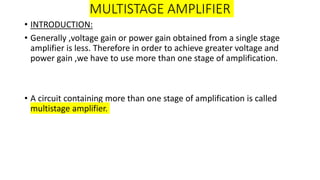 1. A multistage amplifier achieves greater voltage and power gain by using multiple amplification stages connected in cascade. The overall voltage gain is equal to the product of the individual stage gains.