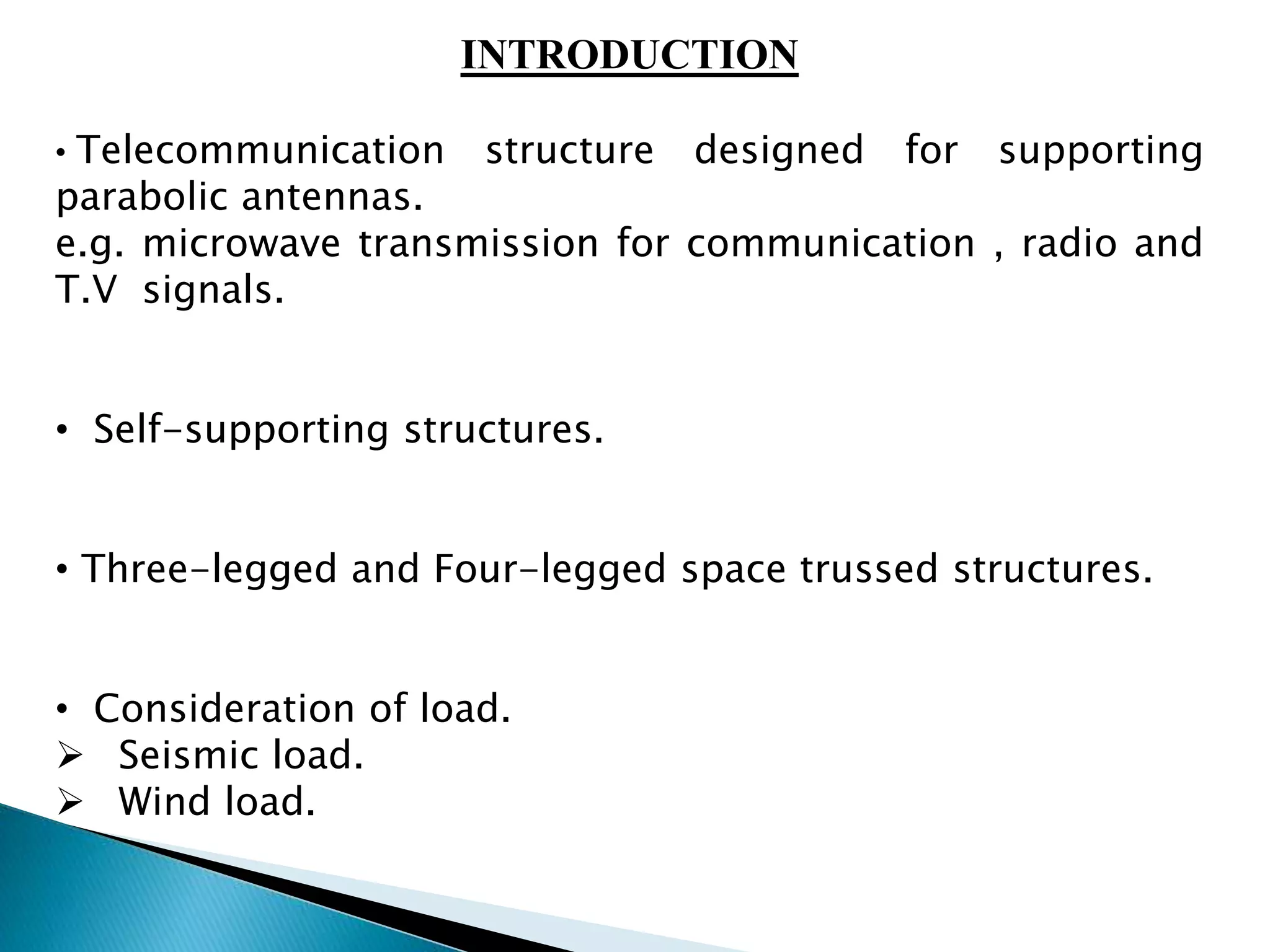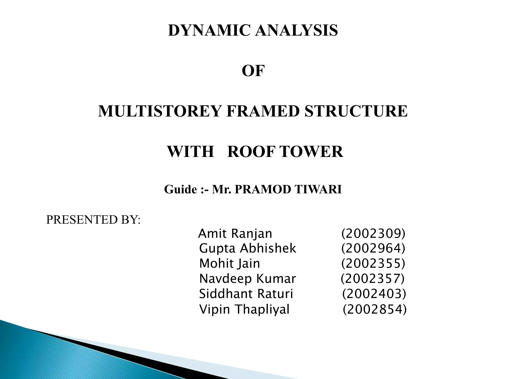 This document summarizes the dynamic analysis of a multi-storey framed structure with a roof tower conducted using STAAD-Pro. The objectives were to model the tower and building, study their response using the response spectra method under seismic loading, and analyze wind loads. A 3-storey building with dimensions and material properties was modeled along with a 15m 4-legged steel tower. Load combinations, mode shapes, and response spectra were defined to obtain displacements of beams and columns for the three structures under different load cases. Structure 2 and 3 showed higher displacements than Structure 1. Wind loads were not considered as the building height was under 10m.