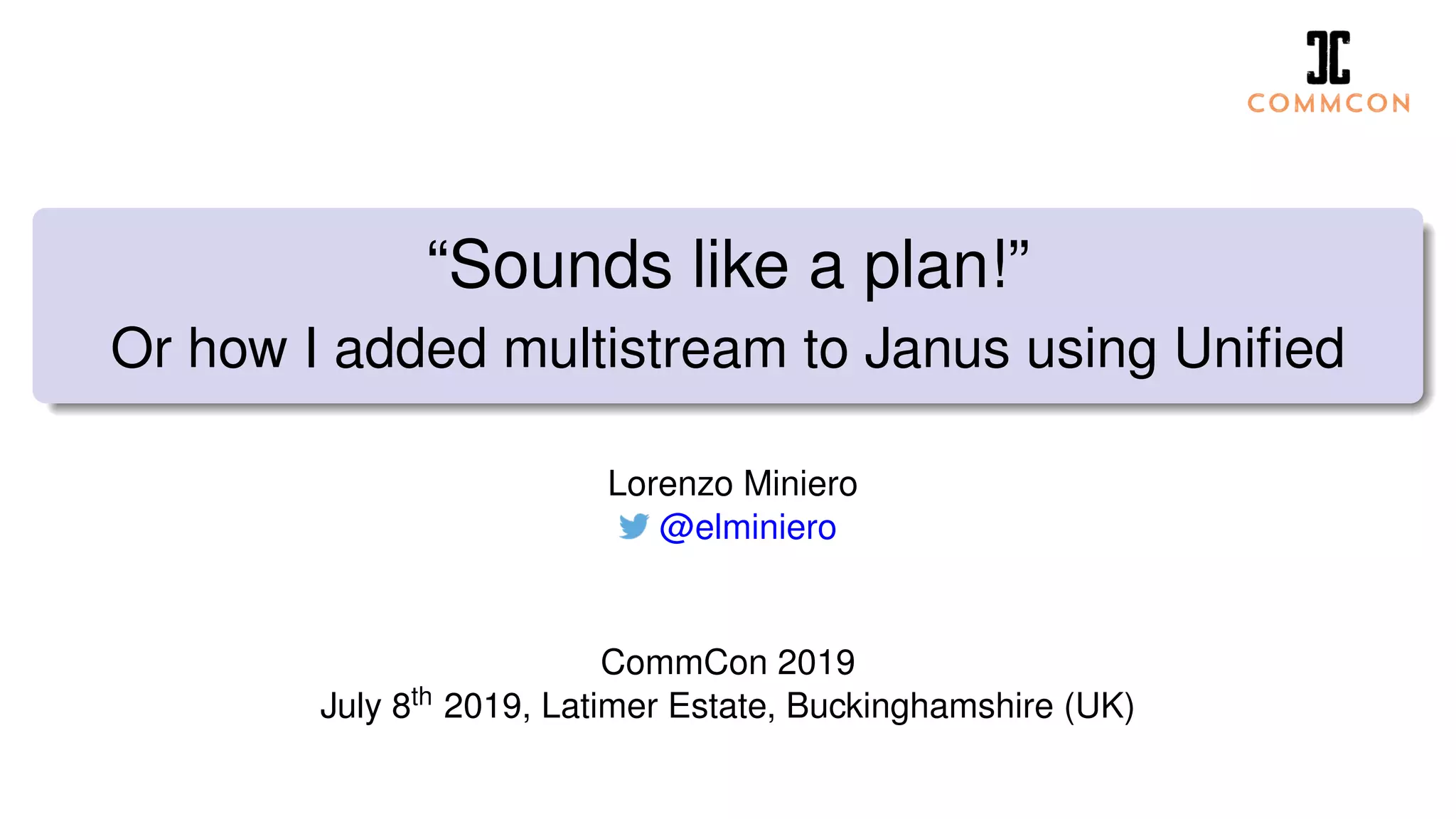 Lorenzo Miniero presented on enhancing the Janus WebRTC server to support multistream functionality at CommCon 2019. The Janus server features a modular architecture with extensible plugins, enabling various real-time multimedia applications, but has limitations on stream connections, necessitating multiple peer connections for additional streams. Future plans for multistream support include exploring standardized methods like Plan B and Unified Plan for improved interoperability among different browsers.