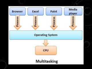 Multitasking operating systems allow more than one program to run at a time using one of two methods: preemptive multitasking, where the OS allocates time to each application, or cooperative multitasking, where programs voluntarily relinquish control back to the OS. Preemptive multitasking is used by modern OSes while cooperative multitasking was used by older systems like Windows 3.x and Mac OS 9.
