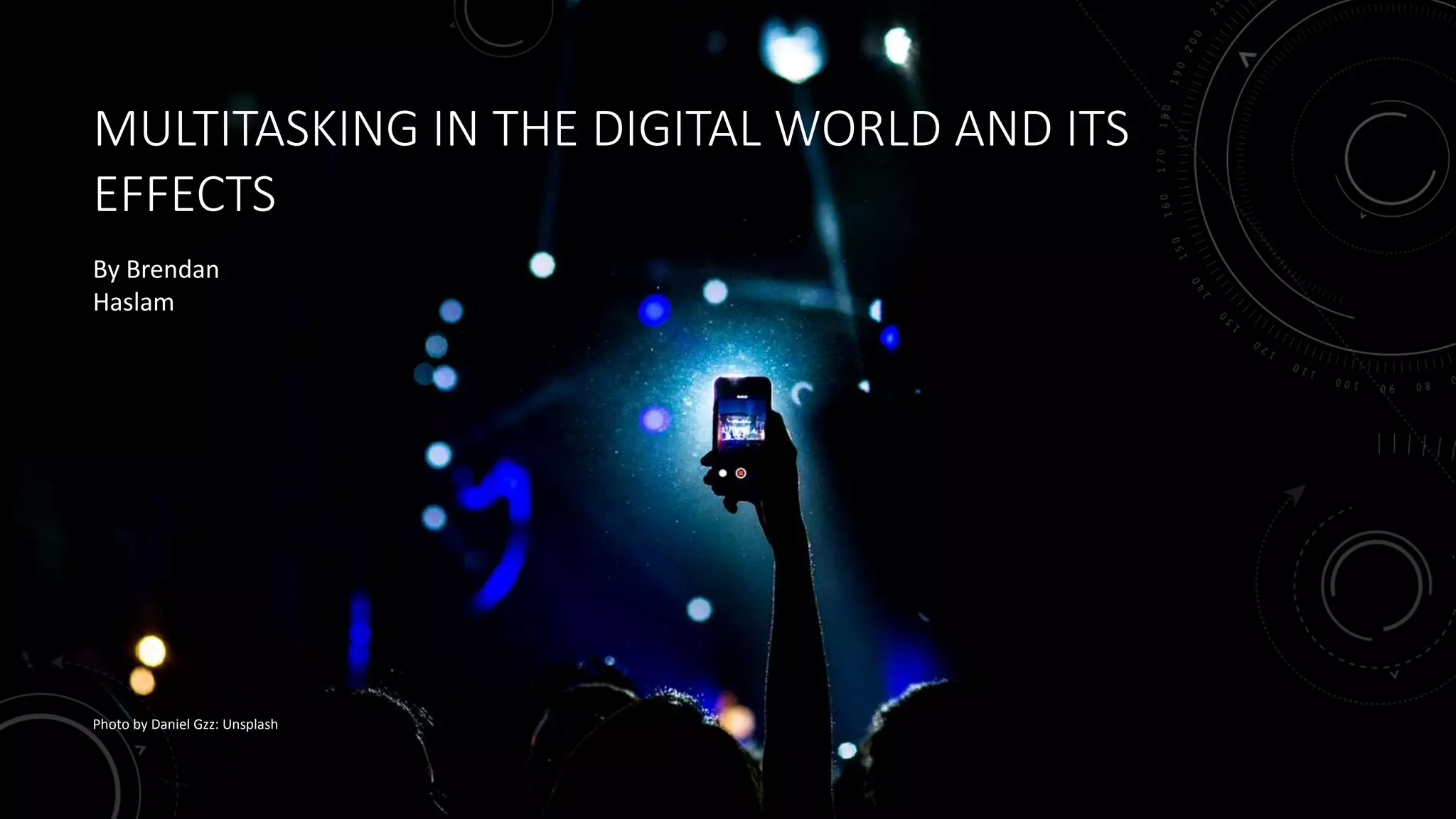 The document discusses the effects of multitasking in the digital world. It notes that with various forms of media being integrated together, there are cognitive effects on people from taking in multiple forms of information at once. Some research has found that high media multitaskers performed better when working with distractions compared to focusing on one task. However, prolonged media use without breaks can lead to withdrawal-like symptoms, and heavy social media use has been linked to poor mental health in teens. In conclusion, while multimedia platforms allow for enhanced information sharing and interaction, they also come with disadvantages regarding addiction.