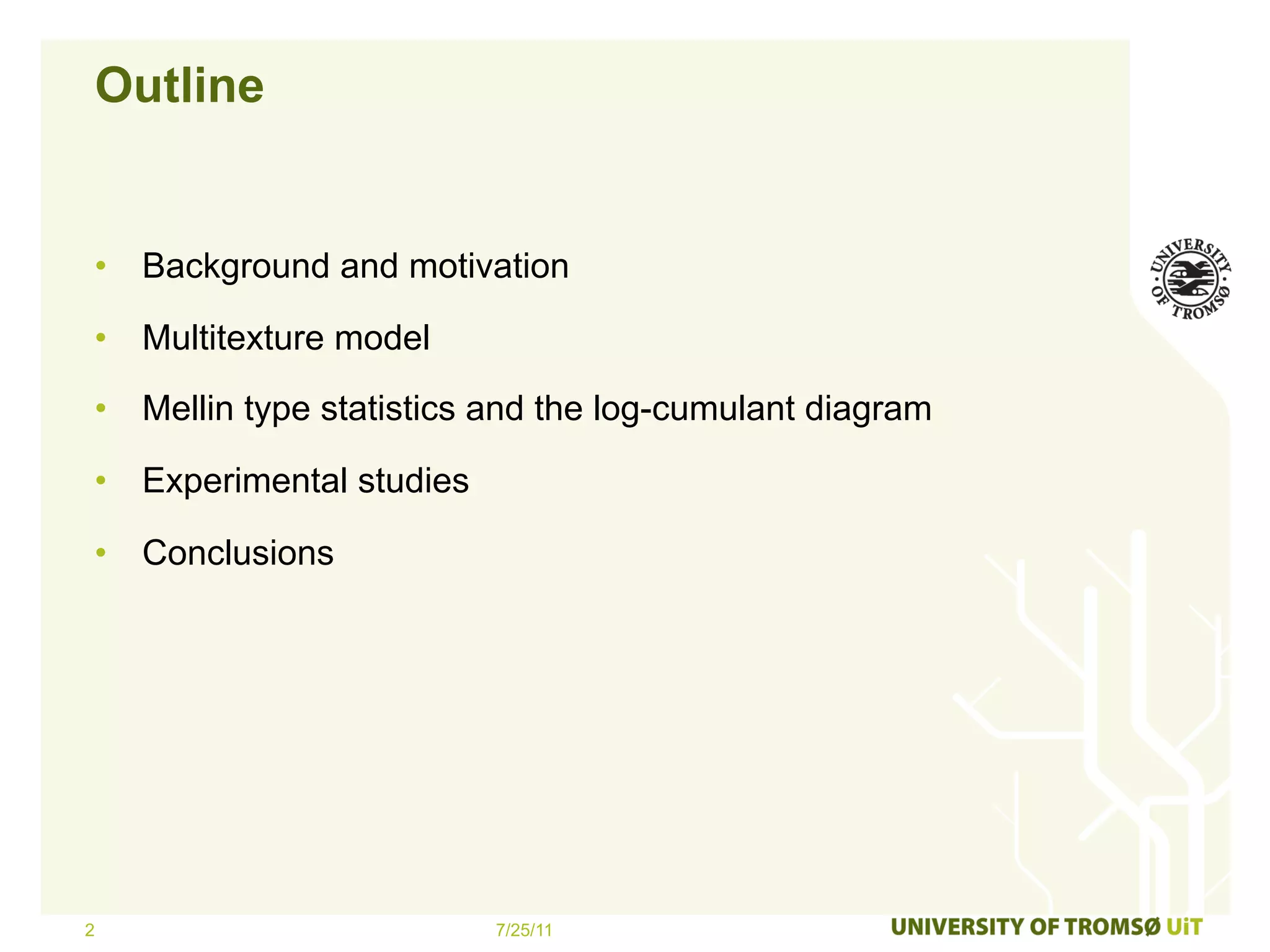 The document presents a multitexture model for analyzing multilook polarimetric radar data. It proposes modeling the scattering vector using multiple texture variables to represent different polarization components rather than a single texture variable. It derives the probability density function of the sample covariance matrix under this model. Experimental results on Amazon rainforest data show the multitexture model fits the data better than single or dual texture models.