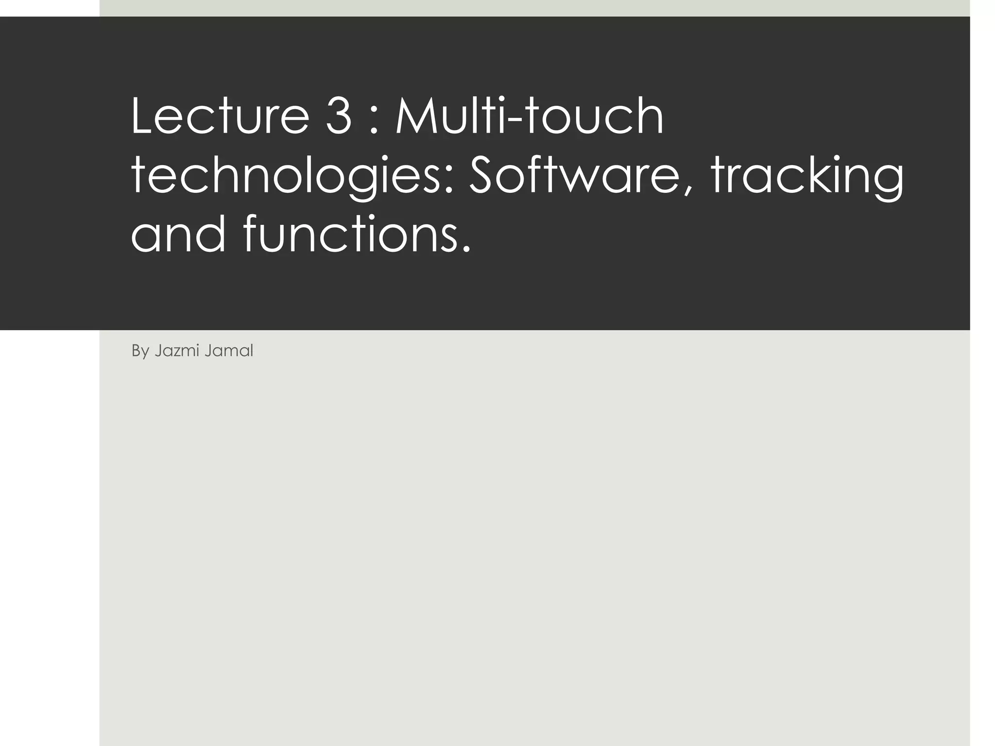 The document outlines a lecture on multi-touch technologies, focusing on software programming for gesture interaction, tracking techniques, and gesture recognition. It highlights various programming languages, methods, and applications, including examples of multi-touch gestures and their functionalities. Additionally, it discusses open-source multi-touch engines like CCV and provides guidelines for configuration and calibration to improve touch interaction accuracy.