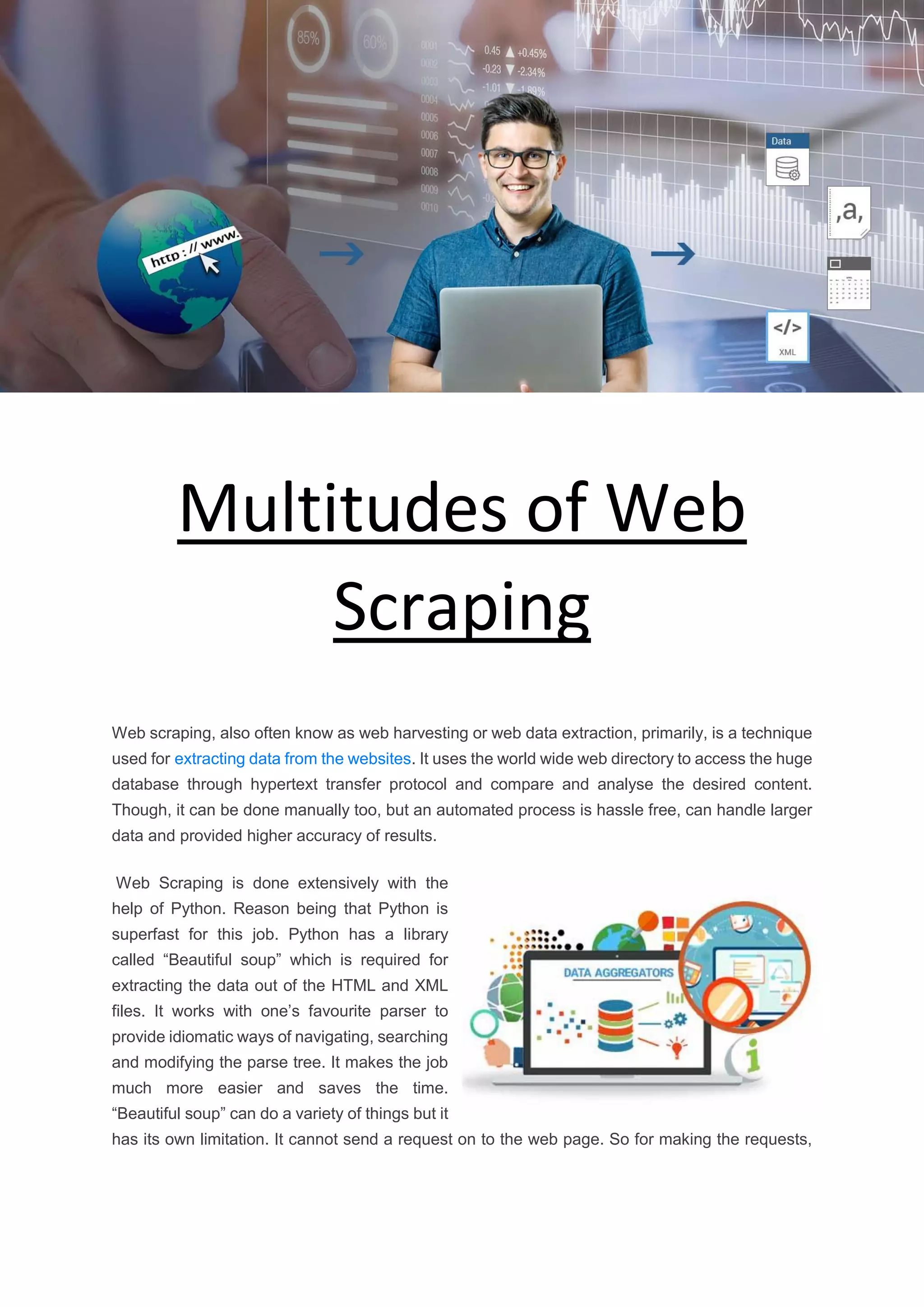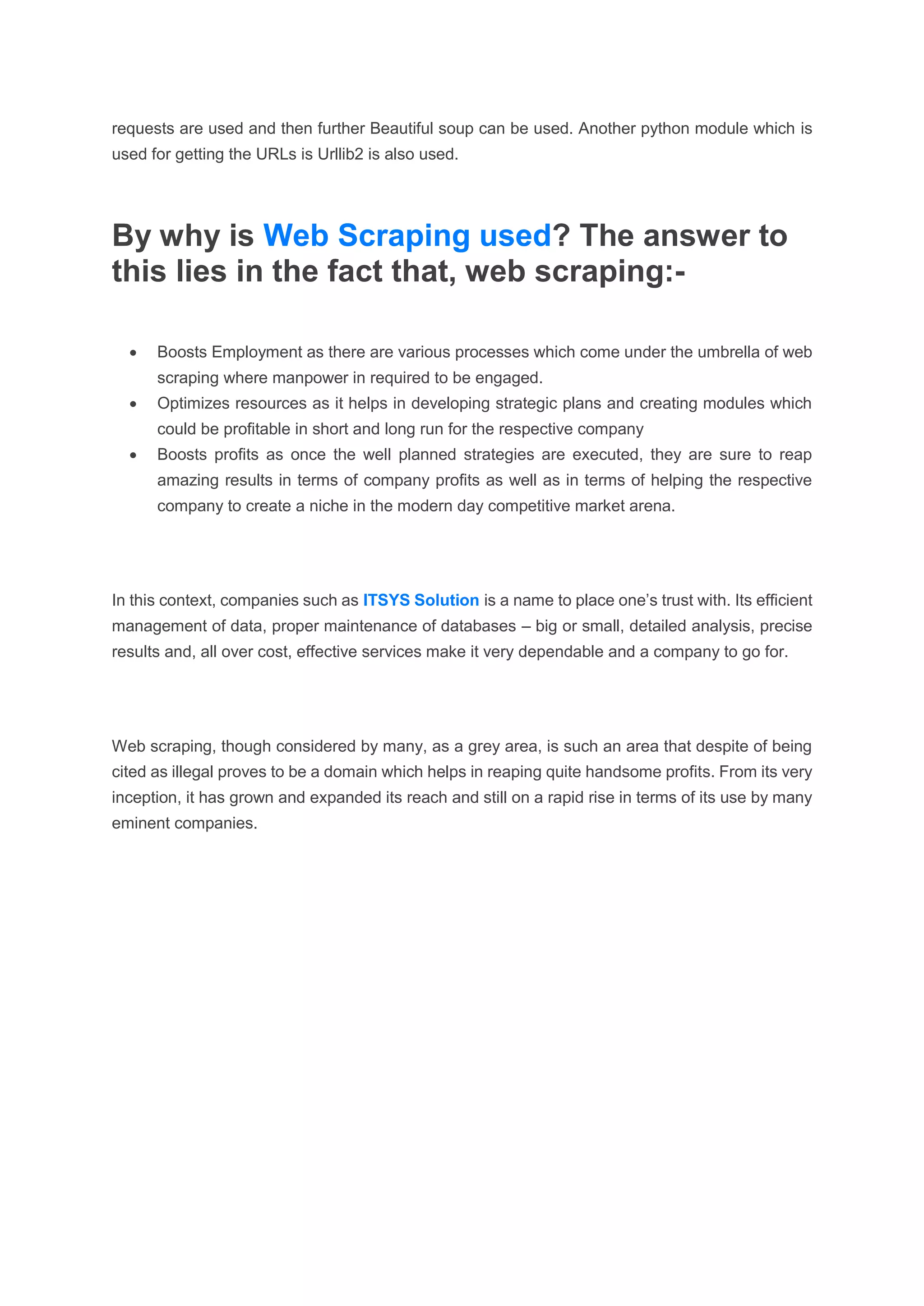Web scraping, or web data extraction, is a technique for retrieving data from websites, primarily using Python due to its speed and libraries like Beautiful Soup for parsing HTML and XML. It enhances employment, optimizes resources, and boosts company profits through strategic data utilization, despite being considered a grey area by some. Companies like Itsys Solutions exemplify effective web scraping practices, offering cost-effective data management and analysis services.
