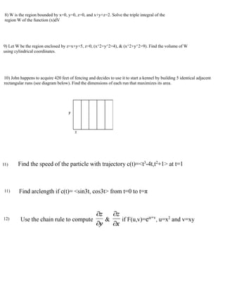 The document outlines topics and exercises for a math final review session, focusing on double integrals, gradient estimation, tangent planes, and optimization problems involving geometric shapes. It includes specific tasks such as evaluating integrals, finding areas, and determining maximum dimensions of configurations. Key problems cover regions defined by inequalities, and the use of cylindrical coordinates for volume calculation.