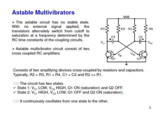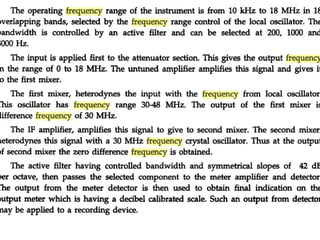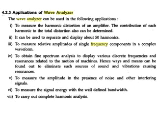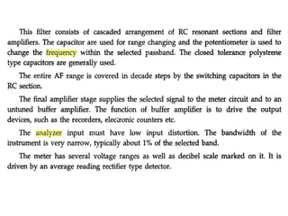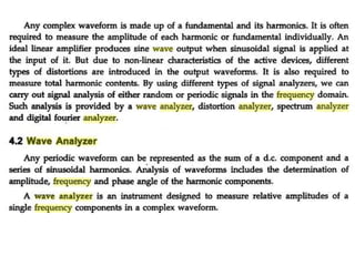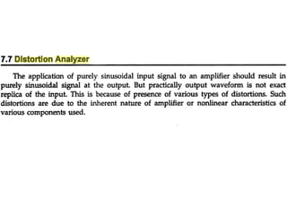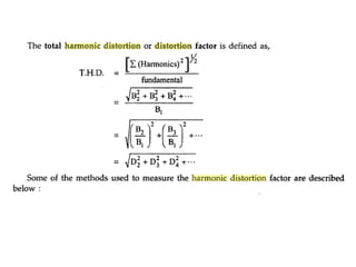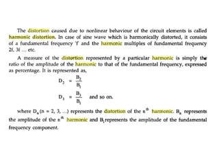 This document discusses harmonic distortion in electronic circuits. It defines harmonic distortion as occurring when a sinusoidal input signal results in a non-sinusoidal output signal due to inherent non-linear characteristics of circuit components. It describes three types of harmonic distortion: frequency distortion from amplifiers having different amplification factors at different frequencies, amplitude distortion from amplifiers generating harmonics of the input frequency fundamental, and phase distortion from energy storage elements causing output signals to be phase-shifted relative to input signals by differing amounts for different frequencies.