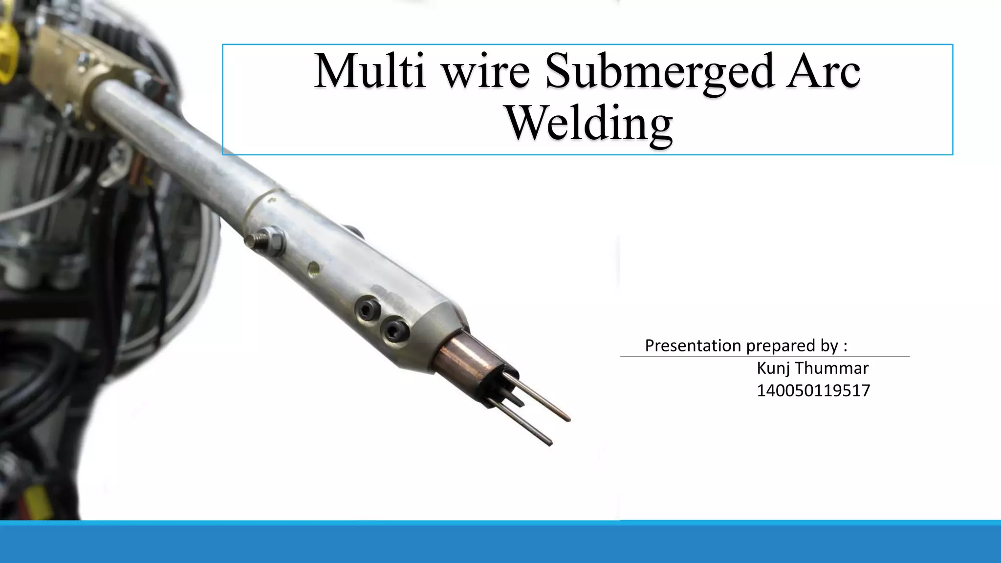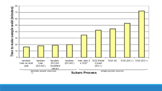 This document discusses multi-wire submerged arc welding. It describes the basic equipment used, which includes a wire feeder, welding power source, and flux feeding arrangement. It then focuses on twin submerged arc welding, which involves feeding two wires in parallel through the same contact tip to increase melt production and stability compared to a single wire. Schematics and diagrams show how twin welding is arranged. Higher deposition rates of up to 38kg/h are possible using four 2.5mm diameter wires in a tandem twin configuration. Parallel and series twin wire configurations are also explained and compared. Charts provide data on deposition rates achievable using single versus twin wire setups. Applications of the twin arc system are mentioned.