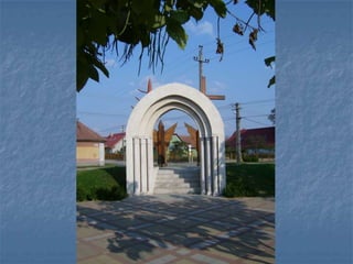 Ócsai millenniumiemlékműTervezte HorváthZoltán építészAz emlékmű a magyar államalapítás ezredik évfordulójára (millenniumára) létesült, és a történelmünket, kultúránkat jellemző kettősséget jelképezi.Nyugat és kelet ütközőpontján országunk a mai napig a keletnek kapuja nyugatra, és a nyugatnak kapu kelet felé. Hol a keletről, hol a nyugatról ránk törő erőkkel viaskodtunk, vagy fogadtuk be azokat. Népünk kultúrájában a keletről hozott és a nyugattól átvett elemek ötvöződnek sajátosan magyarrá.