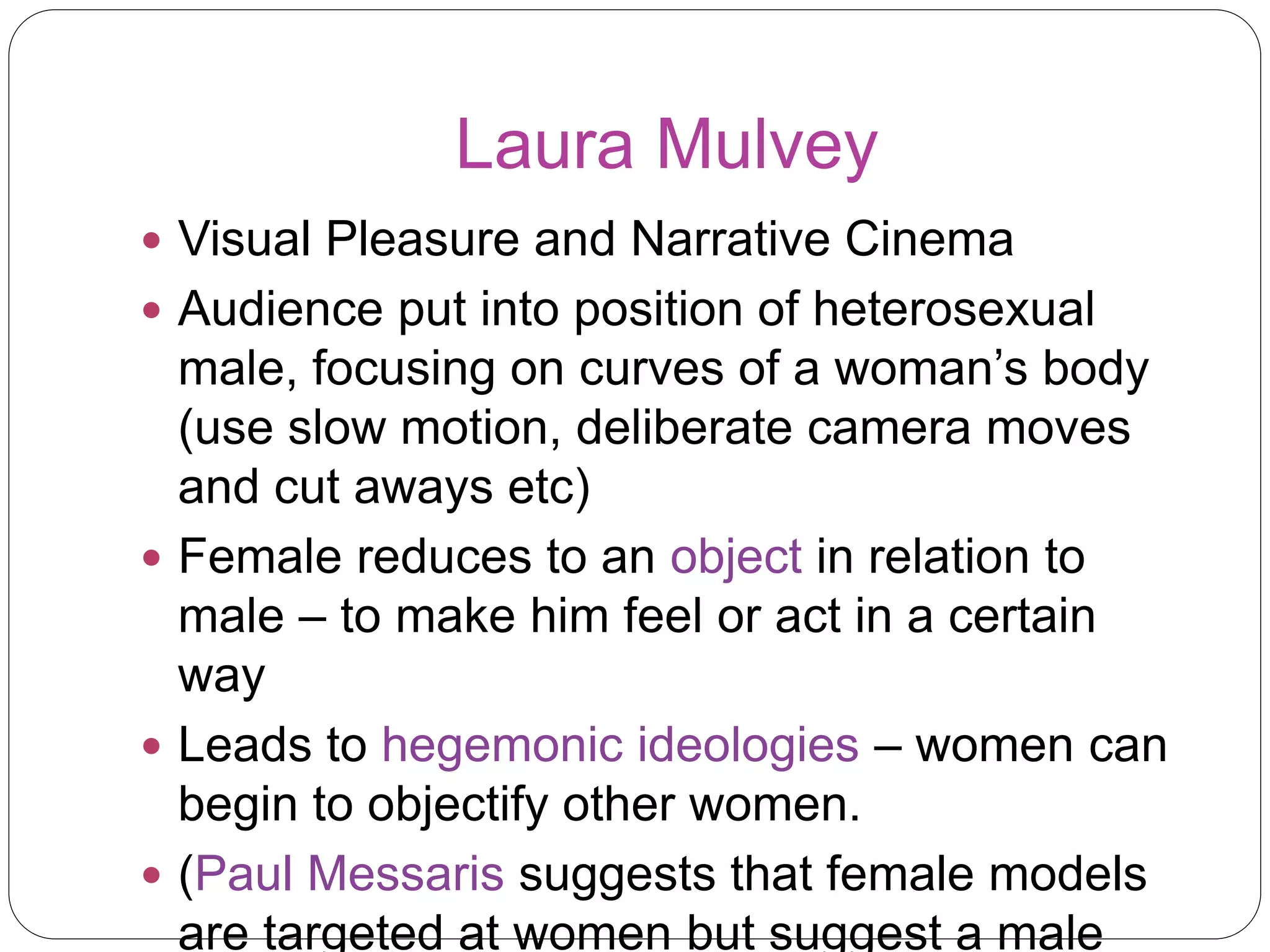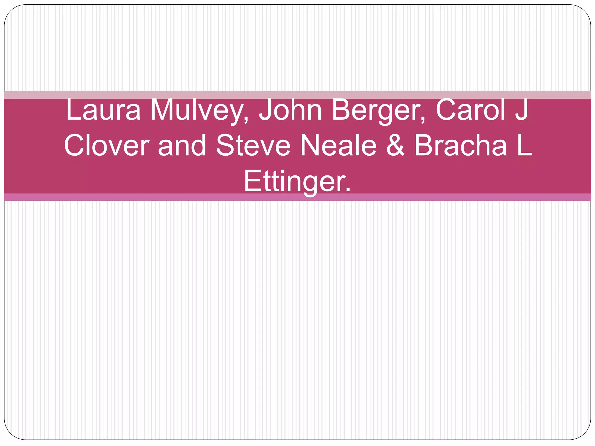 This document summarizes the work of several theorists on gender and cinema. Laura Mulvey introduced the concept of the male gaze in film and how it reduces women to objects. John Berger discussed how women are aware they are being looked at, affecting their behavior. Steve Neale and Bracha Ettinger explored the concepts of the gay male gaze and female gaze in reversing gender roles. Carol J Clover analyzed the final girl character in slasher films who defeats the killer by remaining pure and abstaining from sex.