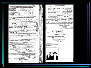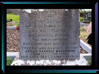 This document provides a history of the Mulvey and Farrell families from Ireland, including a timeline of key events in Irish history from the 1840s Potato Famine to the 1970s. It details the lineages and life events of individual family members, many of whom emigrated from Ireland to the United States in the late 19th/early 20th century, settling primarily in New York. It also includes photographs of family members and homes in both Ireland and America.