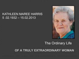 Kathleen Maree Harris lived from February 5, 1932 to February 15, 2013. She was born in Lidcombe, New South Wales, Australia as the seventh child and first daughter of John and Elsie May Bridges. She came from humble beginnings but had a close Catholic family. Throughout her life, she was known as a loving mother, grandmother, aunt, and friend who brought beauty, simplicity, and charm to those around her.