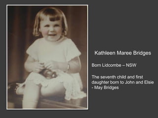 Kathleen Maree Harris lived from February 5, 1932 to February 15, 2013. She was born in Lidcombe, New South Wales, Australia as the seventh child and first daughter of John and Elsie May Bridges. She came from humble beginnings but had a close Catholic family. Throughout her life, she was known as a loving mother, grandmother, aunt, and friend who brought beauty, simplicity, and charm to those around her.