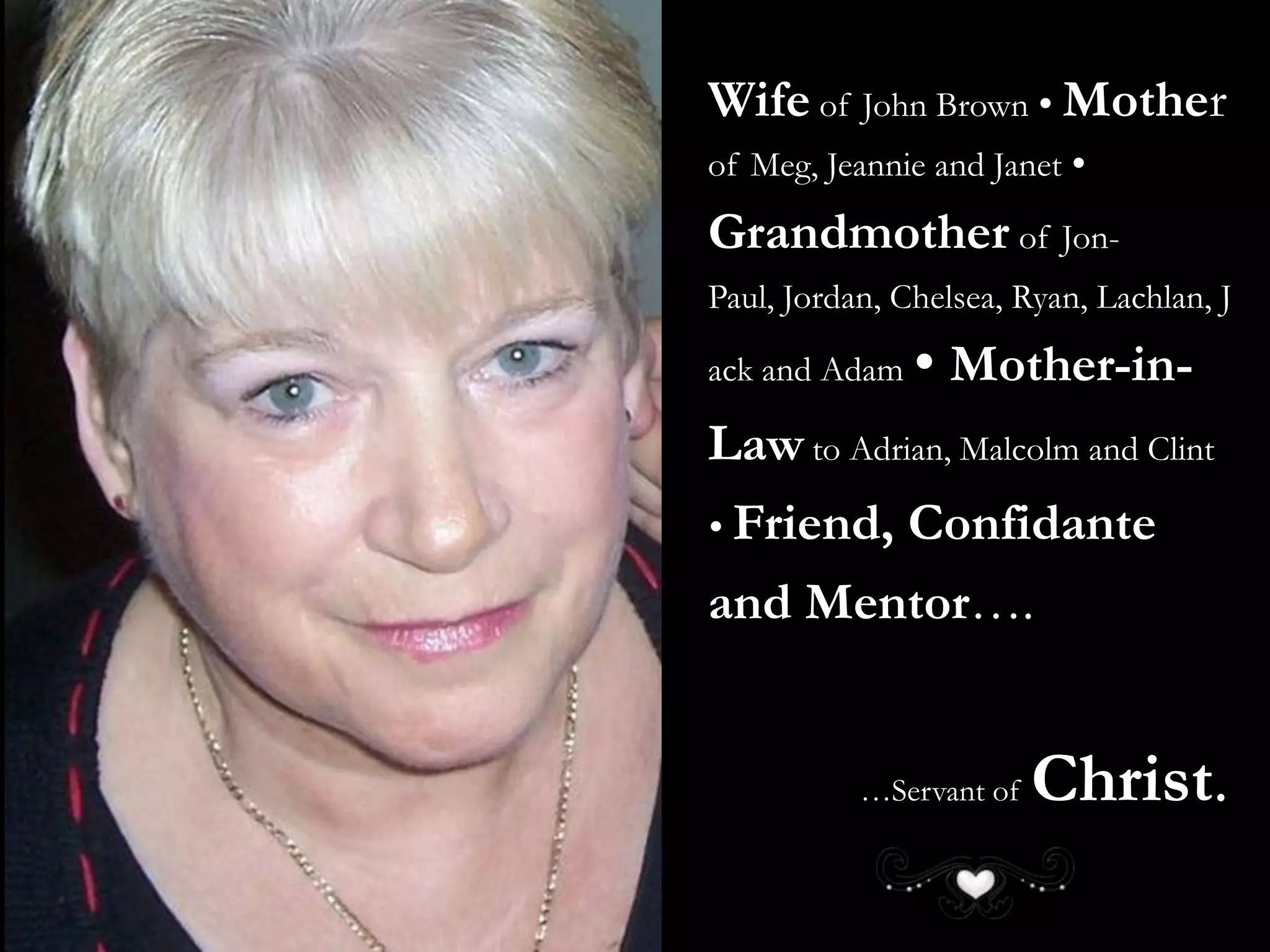 Jean Brown (1945-2011) was a wife, mother, grandmother, mother-in-law, friend, and servant of Christ. She was born in Bellshill, Glasgow and married her husband John in 1965. She was a loving wife, excellent mother to her children Meg, Jeannie and Janet, and doting grandmother to her seven grandchildren. She brought joy to others with her friendship, faith, and love of family.
