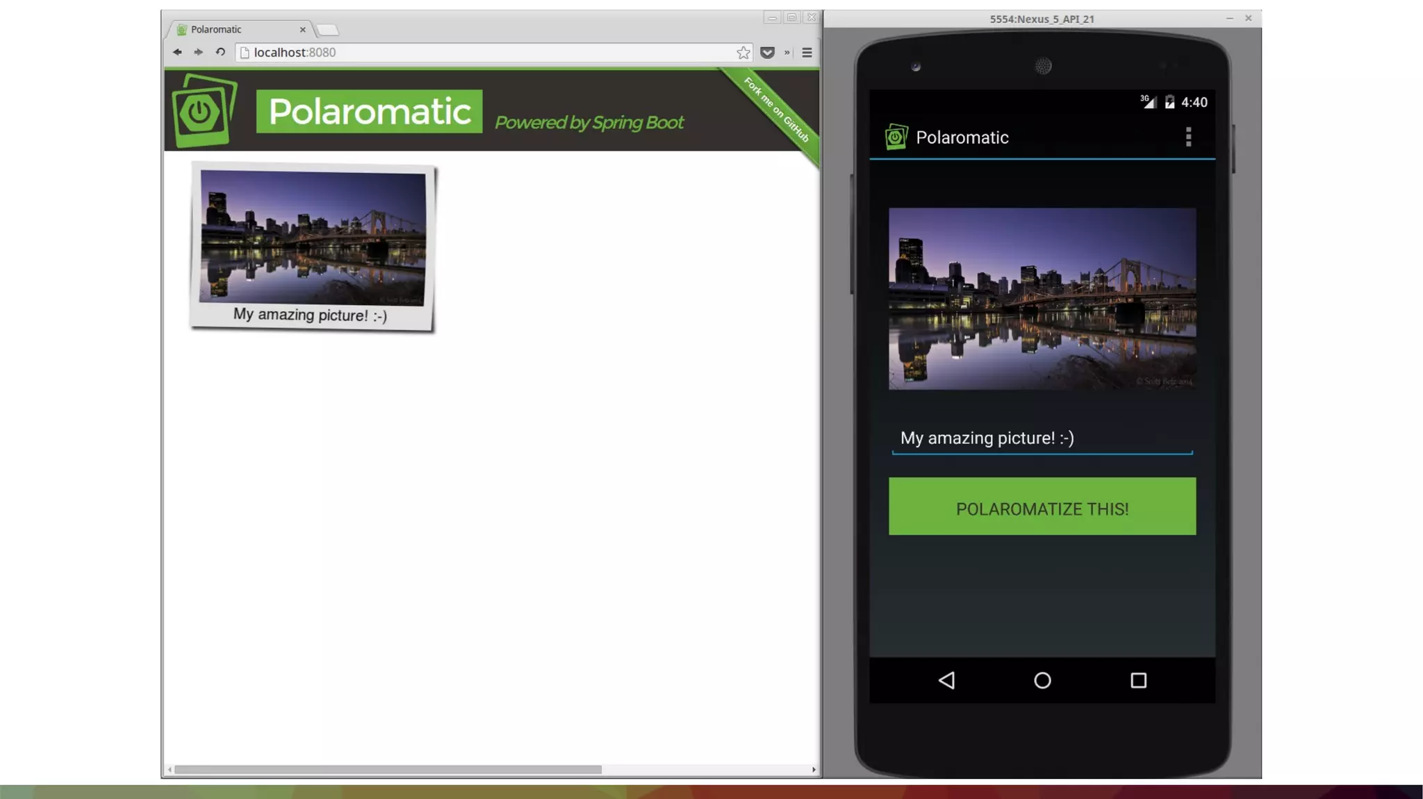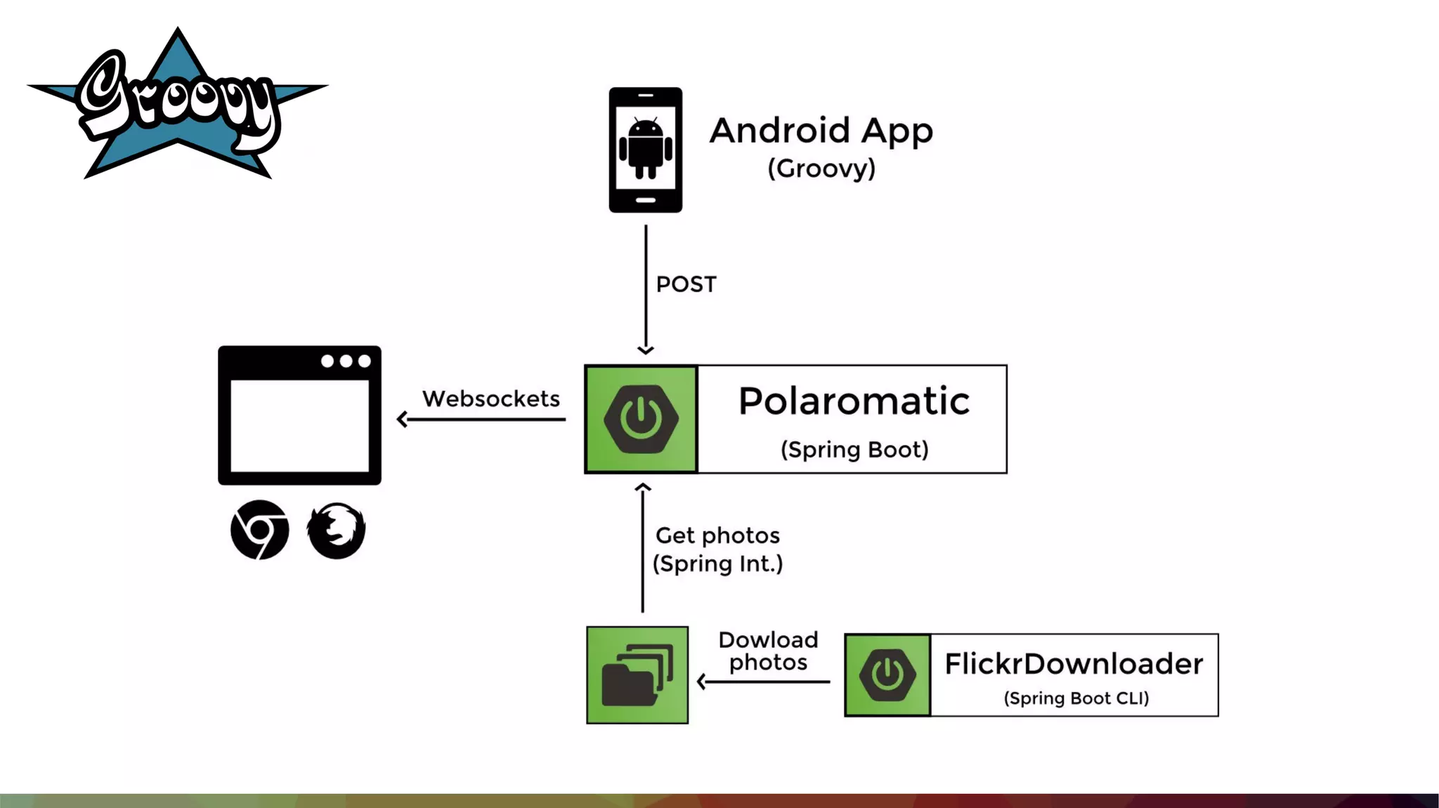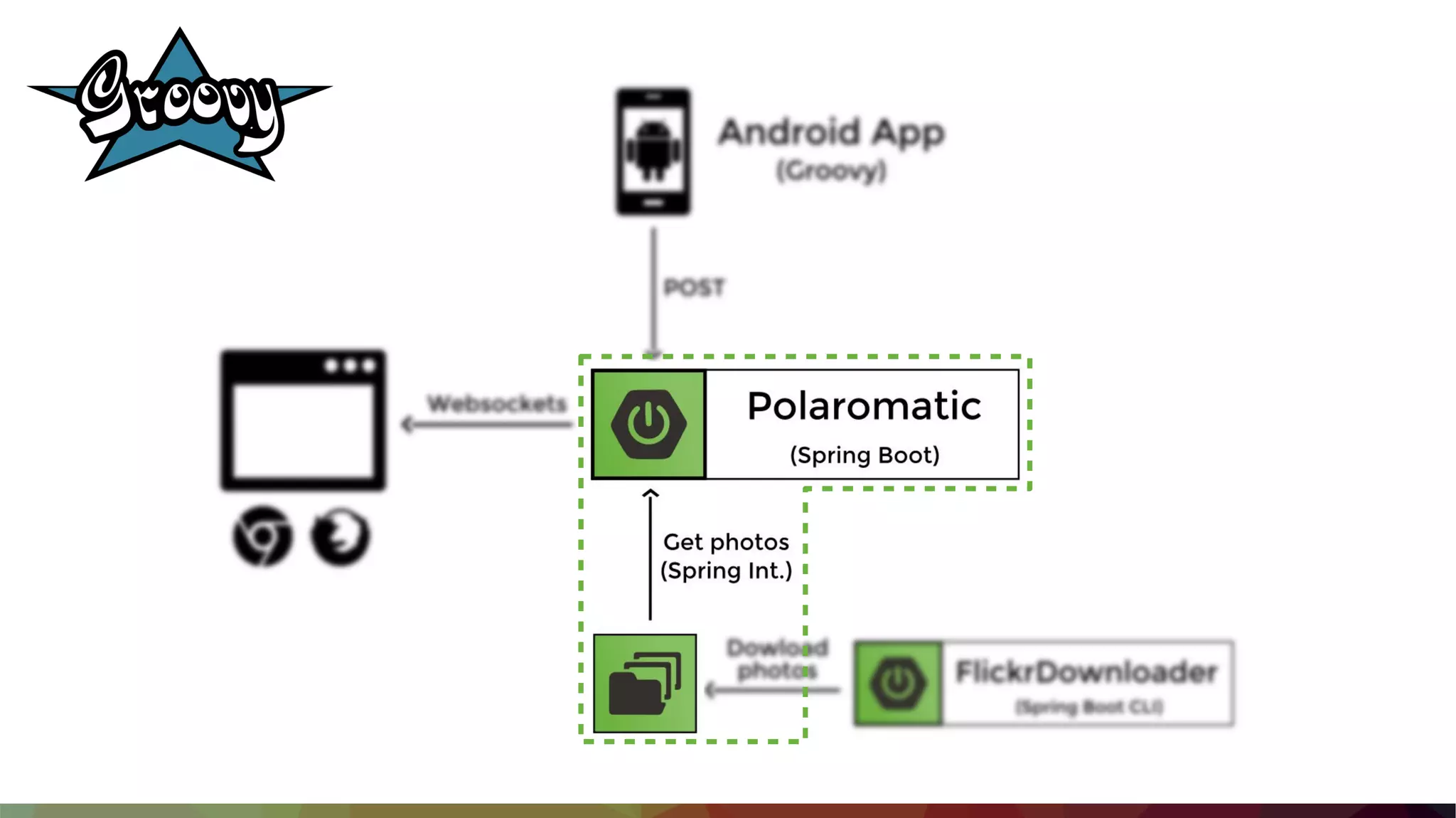 The document discusses the creation of a Groovy-based full-stack application called Polaromatic, which involves backend components for image processing and downloading photos from Flickr. It describes the application's architecture using Spring Boot, integrating services for file handling, image transformation, and real-time browser notifications through WebSockets. Key components of the code are included, detailing service activators, data chains, and the overall flow for processing and delivering images.