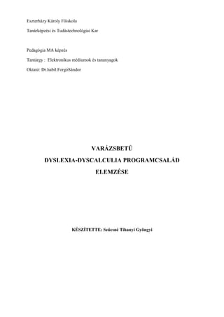 a borító elején a dyslexia –dyscalculia szavak dominálnak, háttérben a szoftver neve: