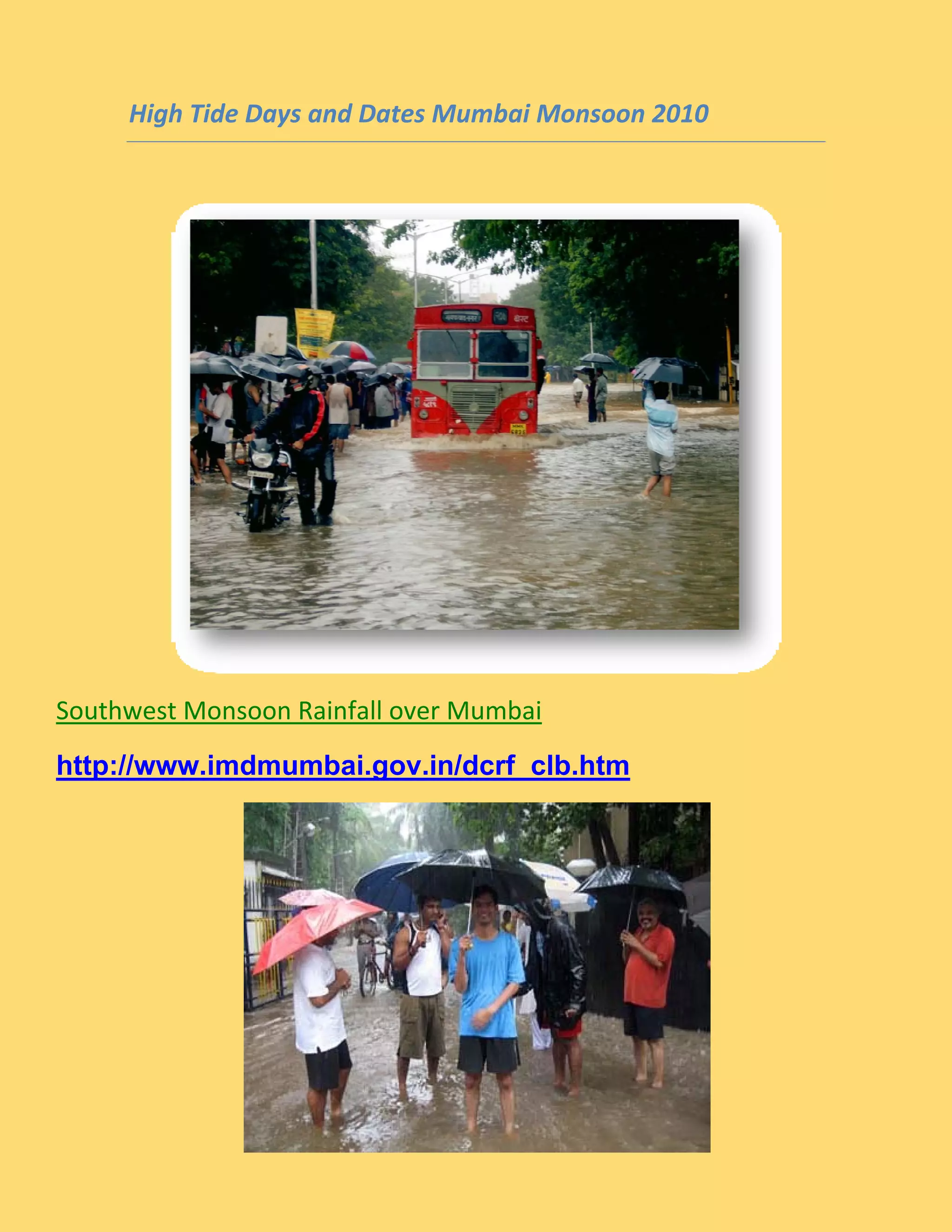 The document outlines the high tide days and dates for the 2010 monsoon in Mumbai, highlighting the potential flooding risks posed by coinciding heavy rainfall and high tides. In excess of 200 mm rainfall within a day or tides over 4.50 meters during moderate rain can lead to flooding. It also provides preparedness suggestions such as maintaining emergency contact details, keeping extra clothing, and stocking food and water supplies.