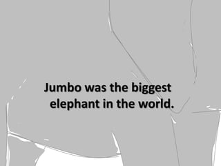 Jumbo was a very large elephant taken from his mother Mumbo by a circus. At the circus, Jumbo was mistreated and kept in a small cage. One night, Jumbo broke free from his cage and escaped. After a long journey at sea on a raft, Jumbo returned home hoping to find his mother Mumbo. However, when Jumbo found Mumbo, she had started a new family and could not go with Jumbo. Sad and lonely, Jumbo left, though he was later spotted reunited with Mumbo again.