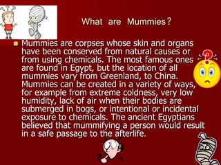 The document summarizes information about different types of mummies from around the world. It discusses how the ancient Egyptians created mummies through deliberate mummification processes to preserve bodies for the afterlife. It also describes naturally formed mummies found frozen in ice or bogs, and outlines different cultural practices for mummification, including among the Chinchocos tribe in South America and in ancient Egypt. The document shares details on famous mummies like Ötzi the Iceman and the Vancouver mummy.