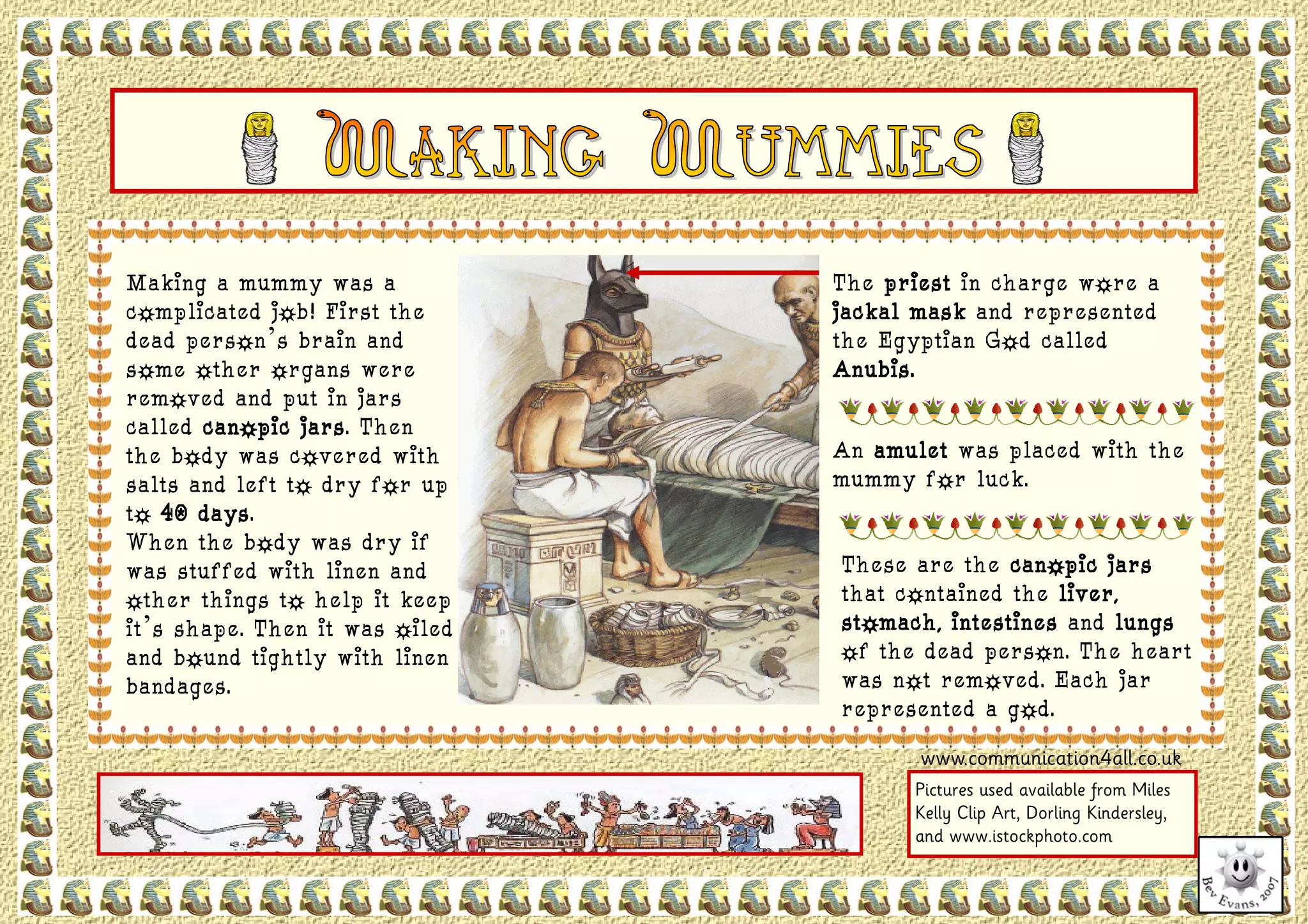 The mummification process involved removing internal organs like the brain and storing them in canopic jars. The body was then dried with salts for up to 40 days, stuffed with linen to maintain its shape, and tightly wrapped in linen bandages. Anubis, the god of the dead, oversaw the process while wearing a jackal mask. Amulets were placed with the mummy for protection in the afterlife. When complete, the mummy was sealed in a coffin and possibly a stone sarcophagus if the deceased was important.