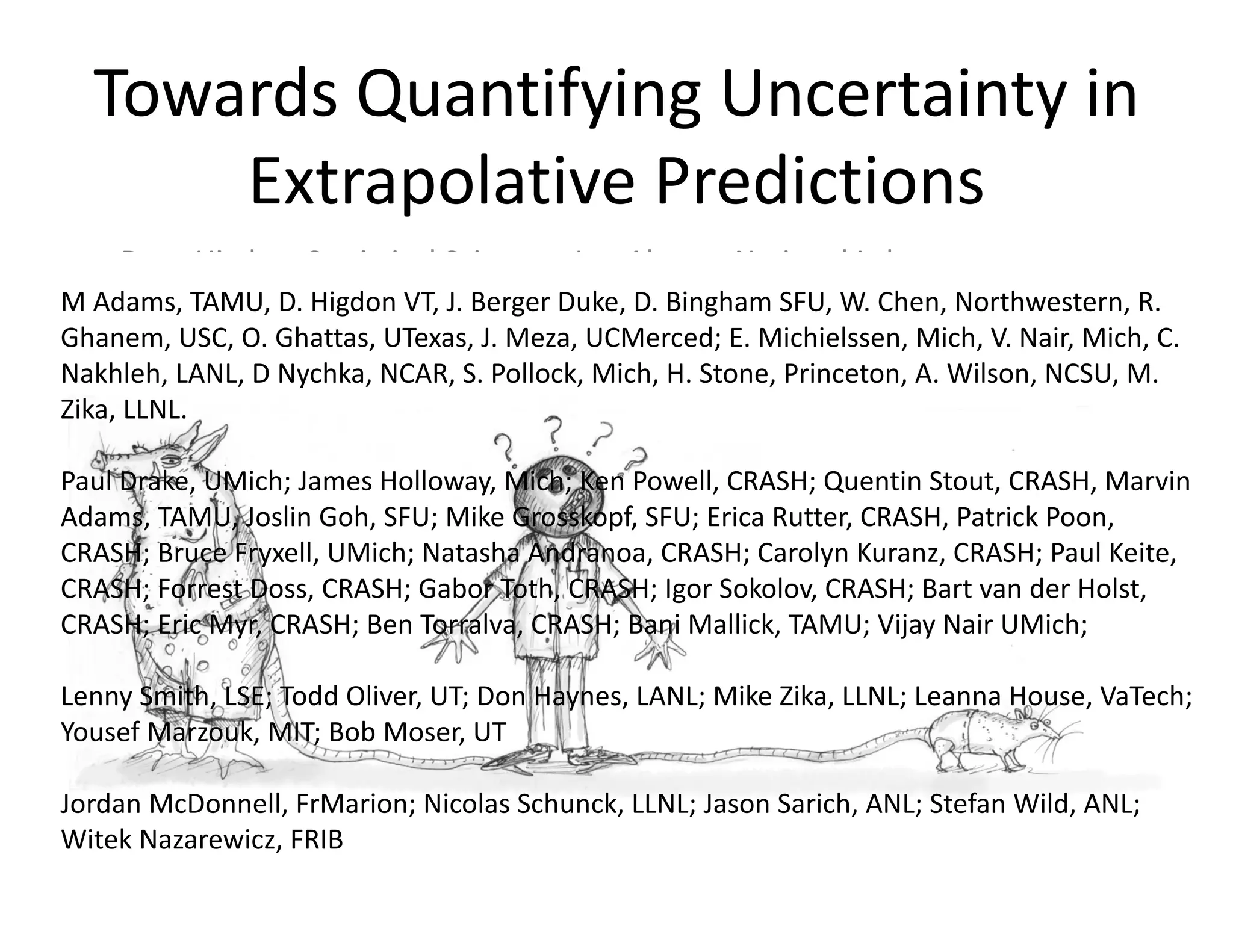 The document discusses methods for quantifying uncertainty in extrapolative predictions using statistical and computational models, focusing on experiments such as dropping balls from heights and radiative shock simulations. It highlights the importance of understanding model limitations and discrepancies when predicting outcomes in extrapolation scenarios. Several examples illustrate the application of these methodologies to improve predictions and manage uncertainties in various experimental settings.